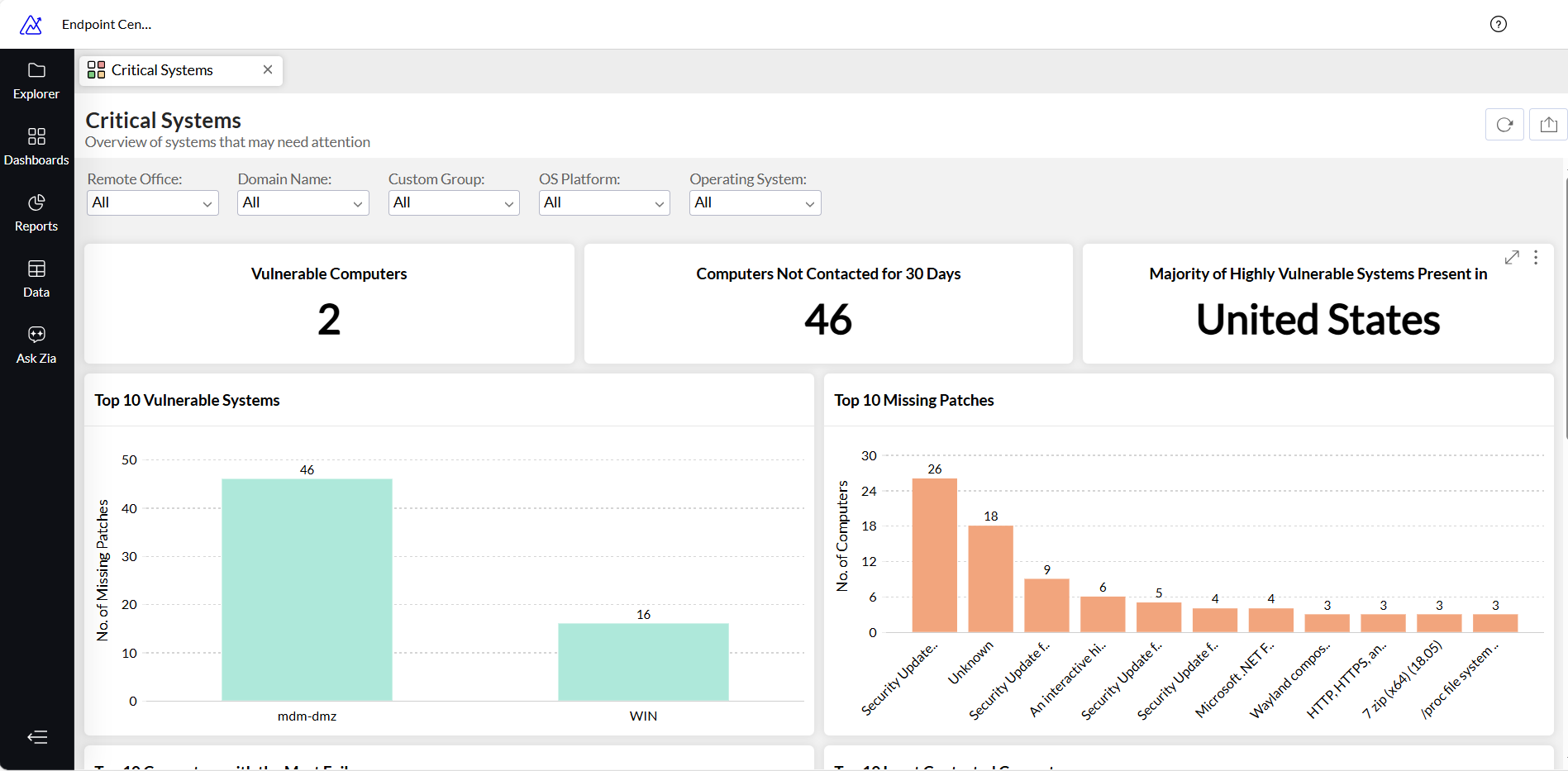 o Procento zařízení, kterým chybí alespoň jeden kritický patch. - Seznam vysoce rizikových zařízení