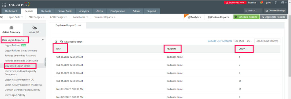 Kategorie User Logon Reports obsahuje 16 předkonfigurovaných reportů, které zobrazují podrobné detaily týkajících se přihlašování uživatelů, selhání přihlášení, uživatelů přihlášených k více počítačům a dalších. V našem článku si povíme detailněji o reportu Day based Logon Errors.