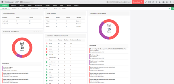 OpManager MSP nabízí komplexní schopnosti monitorování sítě, které poskytují real-time přehled o zdraví a výkonu sítí klientů. Podporuje monitorování síťových zařízení, serverů, aplikací, šířky pásma a dalšího, což umožňuje MSP detekovat a proaktivně řešit problémy ještě předtím, než ovlivní operace klientů. Tento proaktivní přístup pomáhá zlepšit dostupnost sítě a zvyšuje spokojenost klientů.