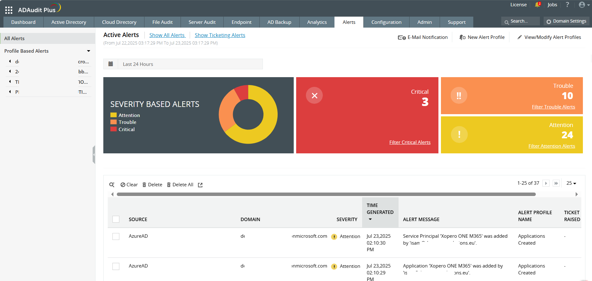 Být informován o kritických událostech je klíčové. AD Audit Plus umožňuje nastavit upozornění na specifické aktivity, jako jsou neúspěšné pokusy o přihlášení, neobvyklé zvýšení oprávnění nebo kritické změny AD. Tato okamžitá upozornění pomáhají IT týmům jednat proaktivně a snižovat rizika.