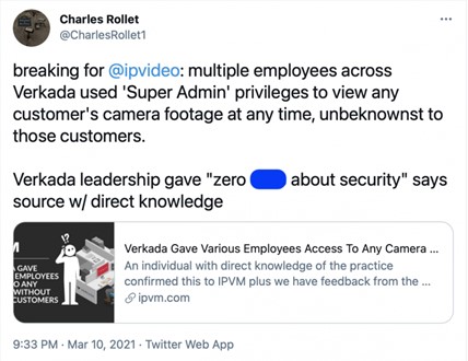 9. března 2021 byla společnost Verkada, softwarová společnost specializující se na výrobu bezpečnostních kamer pro monitorování kontroly fyzického přístupu, napadena hackery.