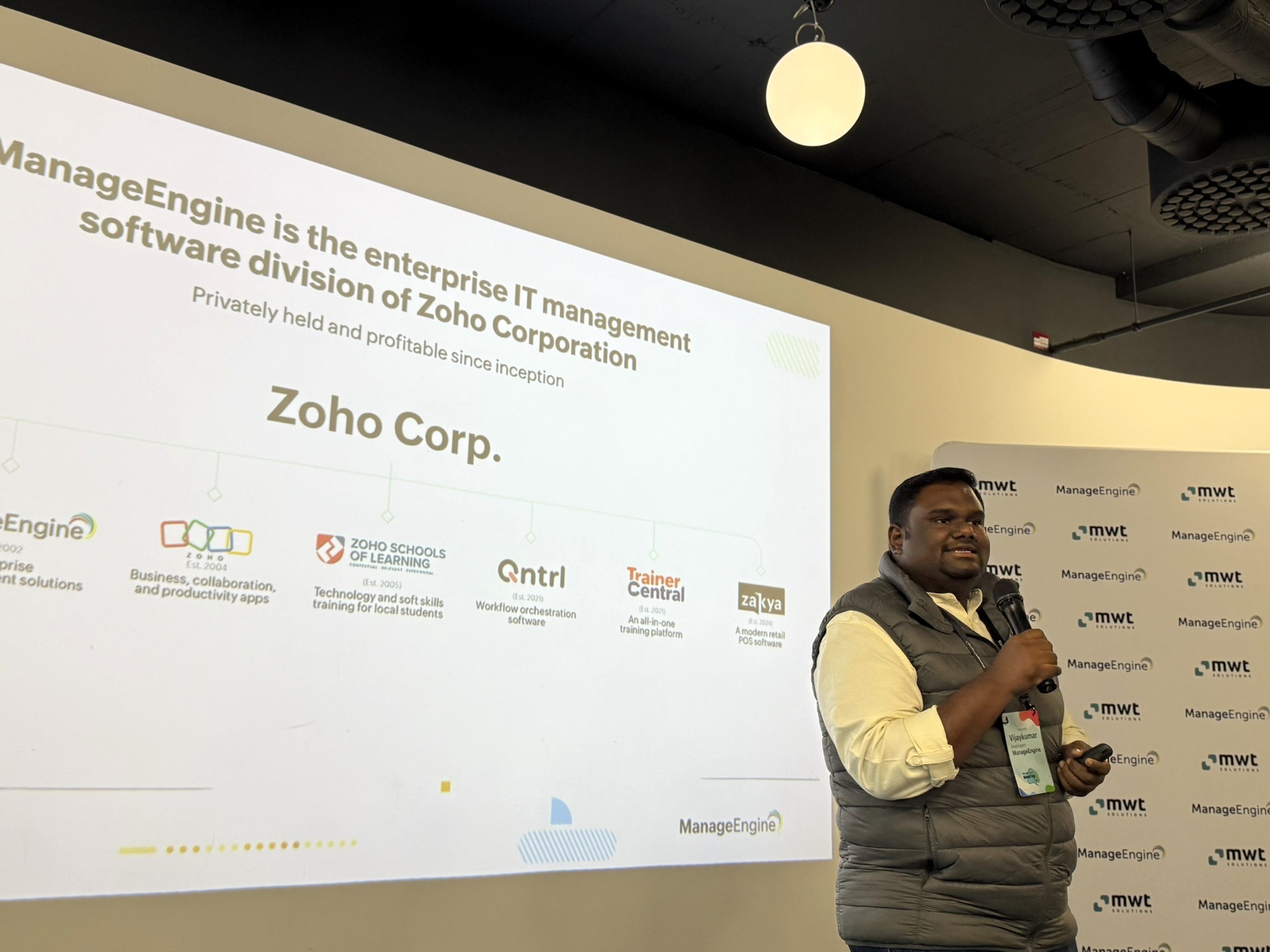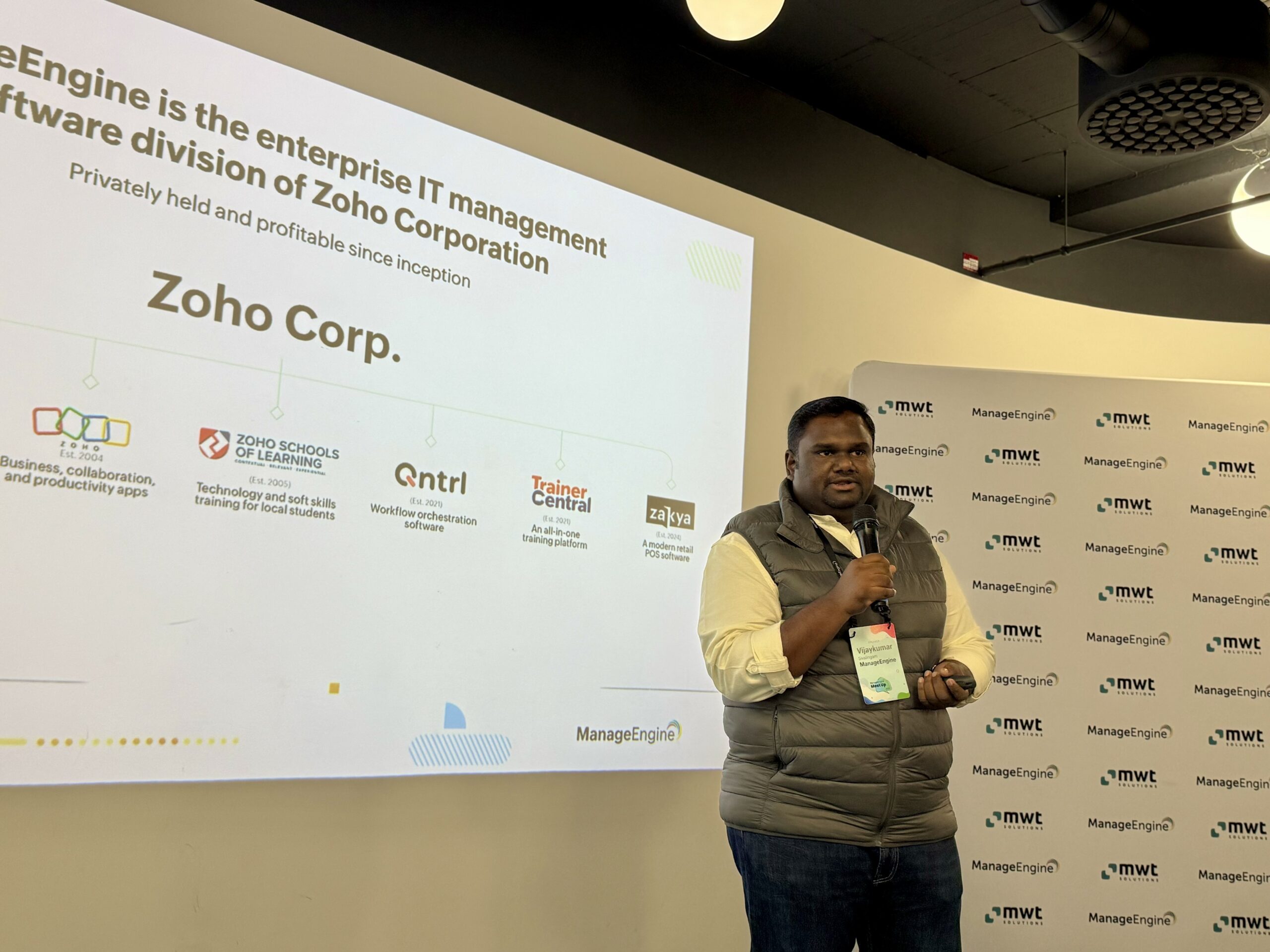 Stretnutie otvoril inšpiratívnym príhovorom Vijaykumar Sivalingam, Country Head spoločnosti ManageEngine, ktorý predstavil víziu rozvoja ManageEngine nástrojov a zdôraznil význam takýchto podujatí pre budovanie komunity okolo moderných IT riešení.