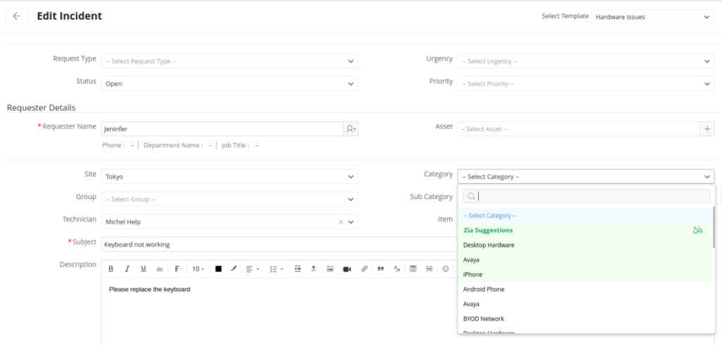 Zia ezt a kihívást úgy oldja meg, hogy NLP-t és gépi tanulást használ a beérkező jegyek tartalmának elemzésére, és automatikusan a megfelelő kategóriába sorolja őket. Például ha egy jegyben szerepel a “jelszó visszaállítása” kifejezés, Zia azonnal besorolhatja azt a “Felhasználói hozzáférés kezelése” kategóriába. Ahogy az AI korábbi jegyekből tanul, a kategorizálás pontossága idővel folyamatosan javul.