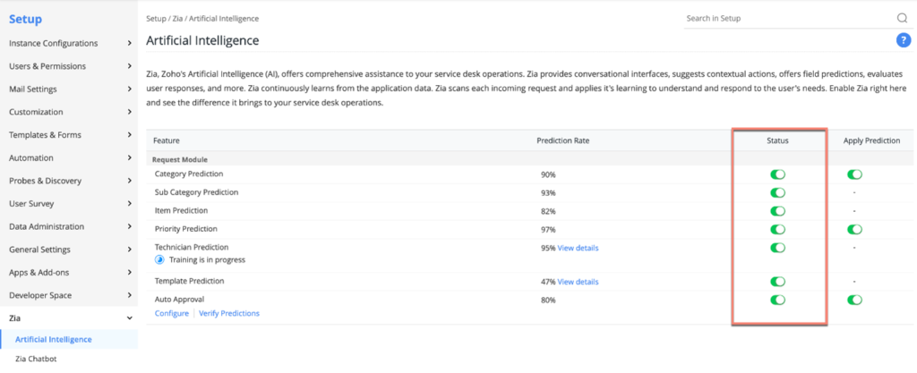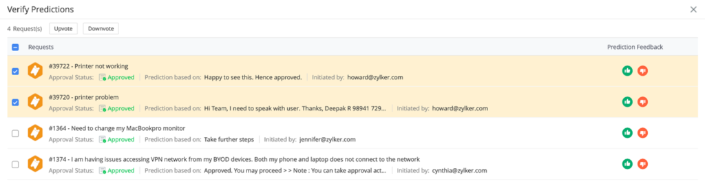 Zia egyik kiemelkedő funkciója, hogy képes megjósolni a szolgáltatásmenedzsment kérelmek jóváhagyási műveleteit a korábbi e-mail válaszok alapján. A jóváhagyási munkafolyamatok, különösen a nagyobb szervezetekben, gyakran nehézkesek, mivel állandó kommunikációra van szükség a kérelmezők, jóváhagyók és technikusok között. A korábbi interakciók elemzésével és a jóváhagyási viselkedésminták megértésével Zia meg tudja jósolni, hogy egy jegy valószínűleg jóváhagyásra vagy elutasításra kerül-e. Ez egyszerűsíti a folyamatot, jelentősen csökkentve a manuális jegyellenőrzéshez szükséges időt.
