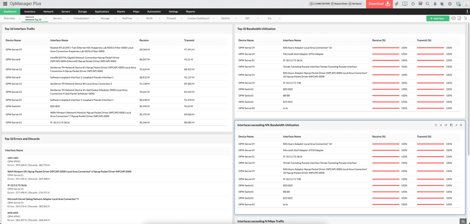 Az egyik legfontosabb előny az egységesség. Az OpManager Plus nemcsak a hálózatot figyeli, hanem integráltan kezeli a sávszélesség-elemzést, a konfigurációmenedzsmentet, a szervermonitorozást, sőt, még a virtualizációs környezetek (VMware, Hyper-V) követését is. Mindezt egy kezelőfelületen belül, teljes összhangban.
