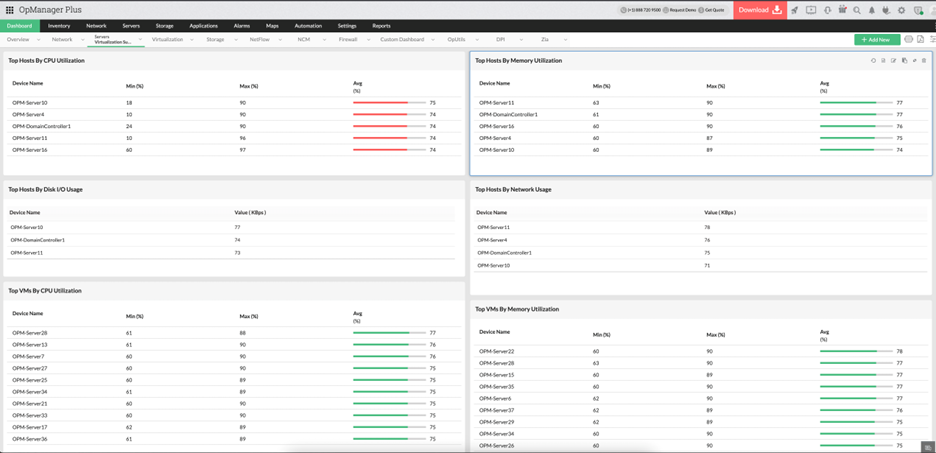 Egy IT csapat nehezen tudta követni a VMware és Hyper-V alapú virtuális gépeiket, mert külön eszközökben gyűjtötték az adatokat. Ez sok időt vett el a hibakeresésből és a kapacitástervezésből. Az OpManager Plus támogatása a virtualizációs technológiákhoz lehetővé tette az összes virtuális gép központi monitorozását, teljesítményük elemzését és az erőforrások optimális elosztását egyetlen felületen.