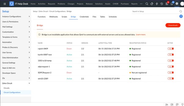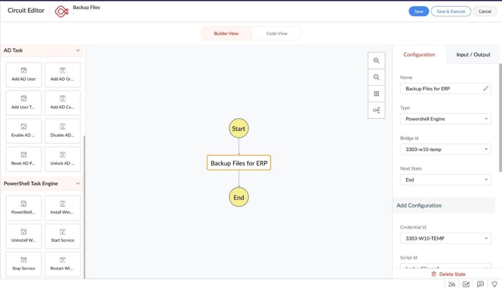 Az egyszeri érintésű munkafolyamatokat a ServiceDesk Plus Cloud-ban a Zoho Circuit, egy kód nélküli/alacsony kódú munkafolyamat-automatizálási platform működteti. A Zoho Circuit lehetővé teszi az IT csapatok számára, hogy vizualizálják folyamataikat, meghatározzák az adatok áramlását és végrehajtsák a műveleteket mind felhőben, mind helyben telepített rendszerekben. Drag-and-drop interfészt biztosít a munkafolyamatok tervezéséhez vagy a JSON kód szerkesztő használatának lehetőségét bonyolultabb feladatokhoz.
