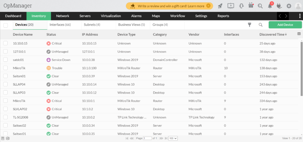 Az OpManager Plus segítségével a hálózati eszközeid (útválasztók, kapcsolók, szerverek, tűzfalak és egyebek) könnyen kategorizálhatók az eszközök jellemzői, gyártója és hálózati típusok szerint, mindez egyetlen konzolból elérhető.