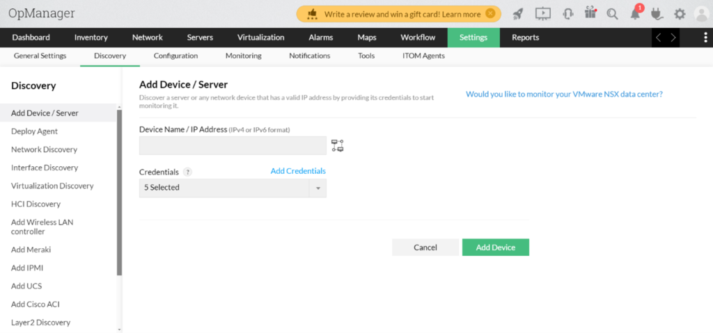 OpManager Plus megkönnyíti a hálózati eszközök hozzáadását és konfigurálását.