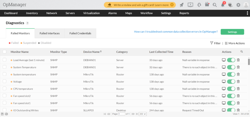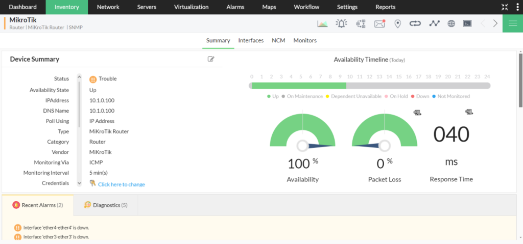 Az OpManager Plus lehetővé teszi, hogy az adminisztrátorok meghatározzák a hálózati eszköz hibáját, annak okát és az eszköz meghibásodásának okát.