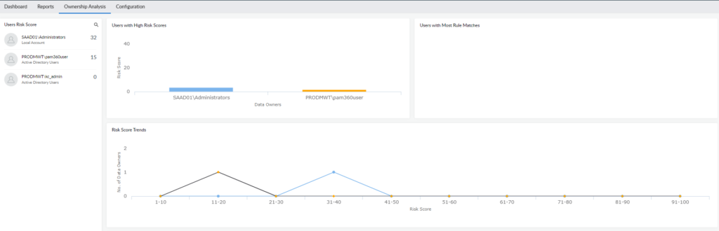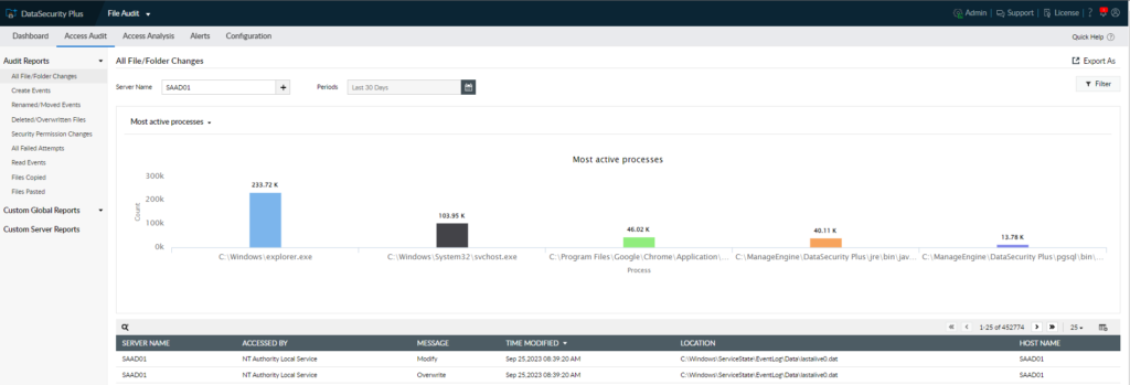 A Data Security Plus gépi tanulási algoritmusokat használ a felhasználói és entitás viselkedés elemzéséhez, észleli az anomális tevékenységeket, amelyek belső fenyegetésekre vagy kompromittált fiókokra utalhatnak. Normál viselkedési alapvonalakat állapít meg, és riasztásokat indít, ha eltérések történnek.