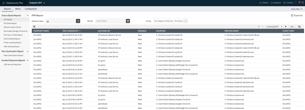 A Data Security Plus folyamatosan monitorozza az adatokat a hálózaton, szervereken és végpontokon, valós időben. Fájlokat és adatbázisokat pásztáz érzékeny információkra, mint például hitelkártya-számok és személyazonosító információk (PII), és figyelmezteti a rendszergazdákat a potenciális biztonsági kockázatokra.