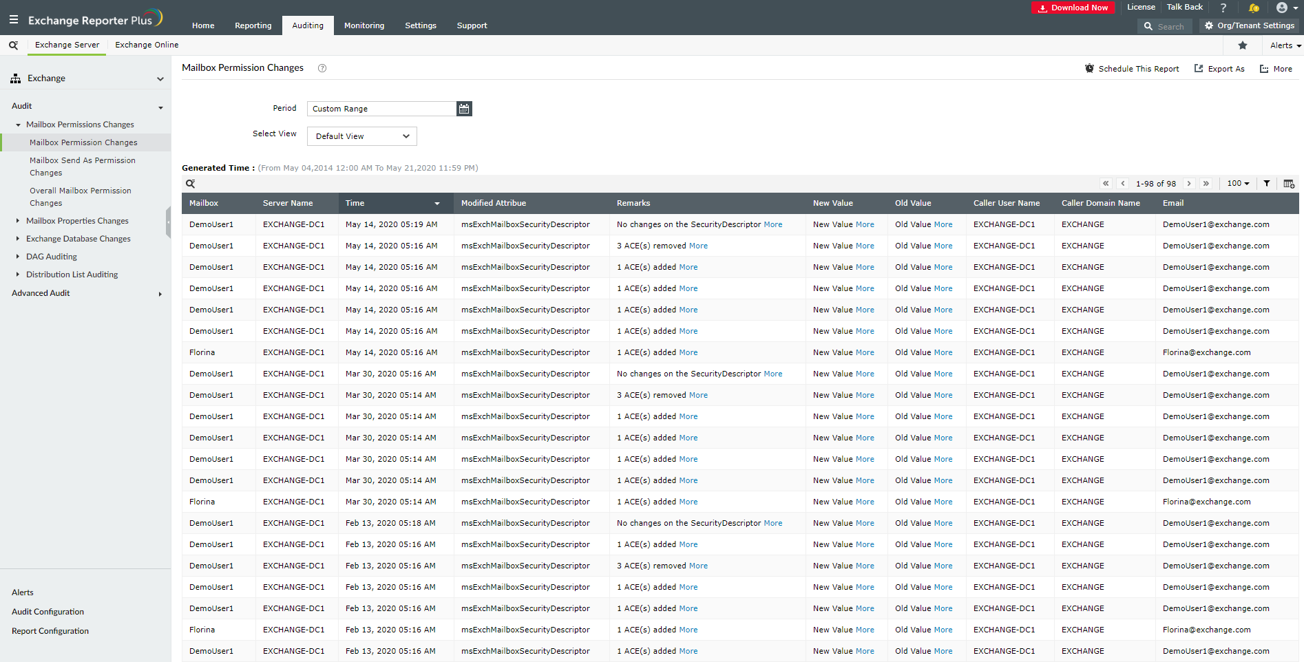 Az eszköz eseménynaplózó funkcióval rendelkezik az Exchange és az Exchange Online kiszolgálók számára. Jelentés készítésekor kiválaszthat egy meghatározott időszakot, tartományt és eseményeket, amelyeket munkaidő alatt vagy azon kívül rögzítettek. Mindegyik jelentés hozzáadható egy ciklikus ütemezéshez, majd elküldhető a lemez egy kiválasztott útvonalára.