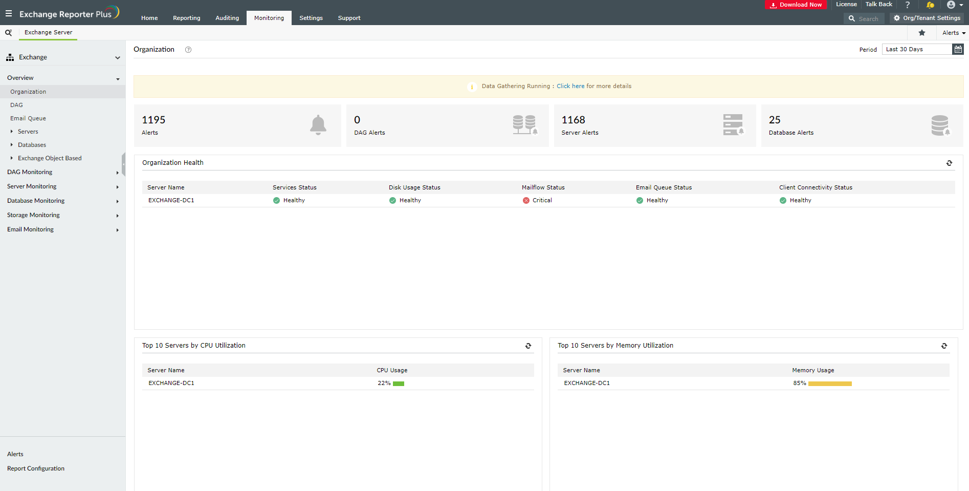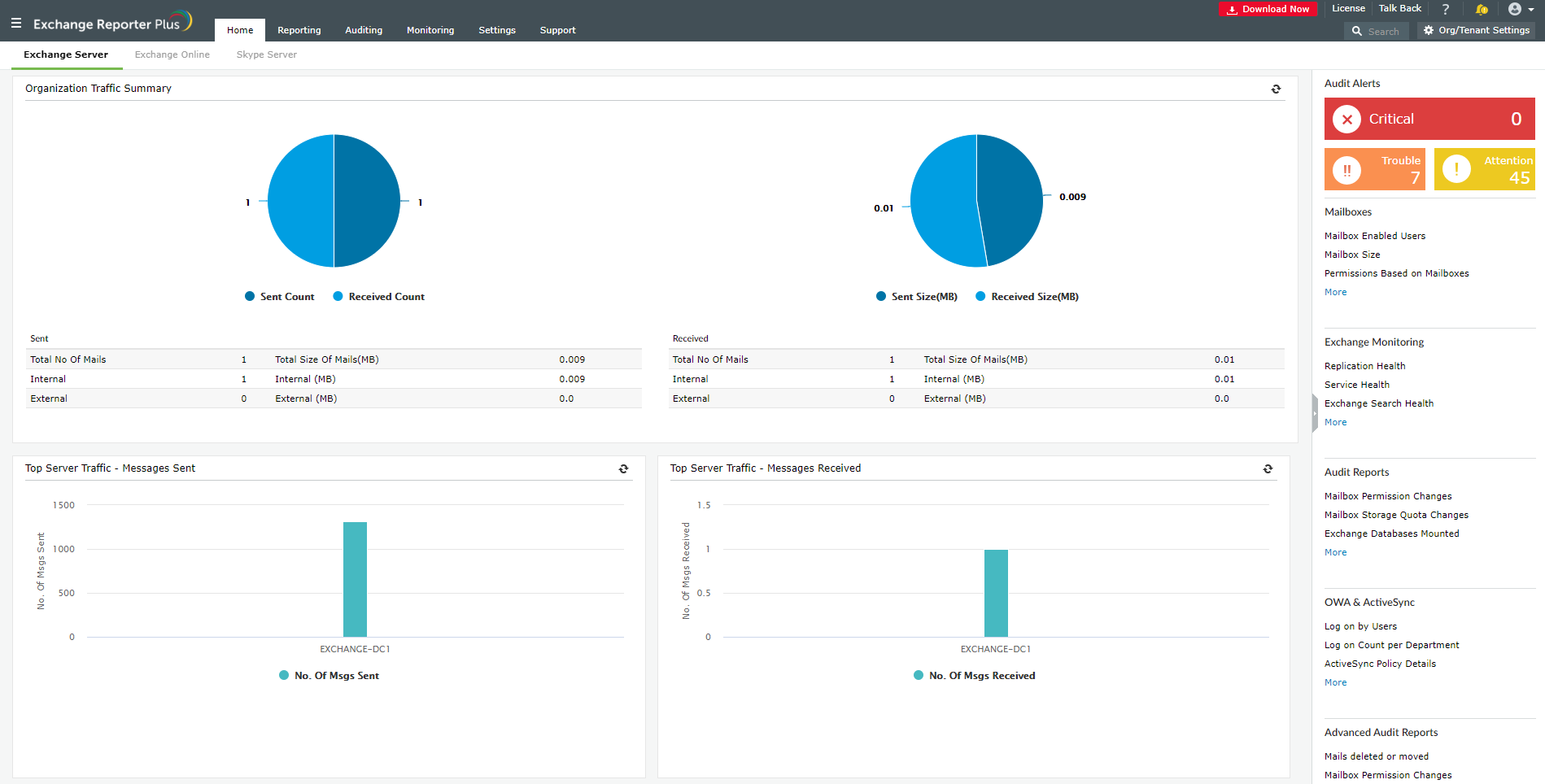 A rendszer képes grafikusan bemutatni az Exchange környezet tevékenységét és figyelemmel kísérni annak állapotát. Az irányítópulton láthatók azok a felhasználói postafiókok, amelyek a legtöbb helyet foglalják el. Az eszköz rendelkezik egy jelentési funkcióval is, amely információkat tartalmaz a szerveren még fennmaradó helyről.