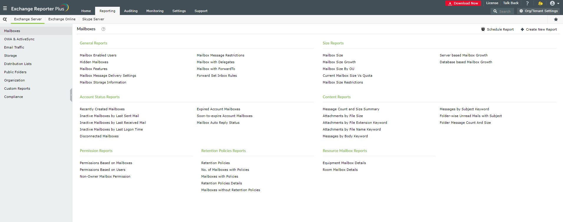 Az Exchange Reporter Plus hozzáférést biztosít a postafiók-jelentések átfogó adatbázisához, például méretükhöz, a bennük található mellékletekhez és akár kulcsszó-keresésekhez is. A jelentési funkció lehetővé teszi olyan erőforrások ellenőrzését is, mint például a nyilvános mappák, a fennmaradó lemezterület és az OWA & ActiveSync jelentések. Ezenkívül az összes létrehozott jelentés CSV, PDF, XLS vagy HTML fájlba is elküldhető.