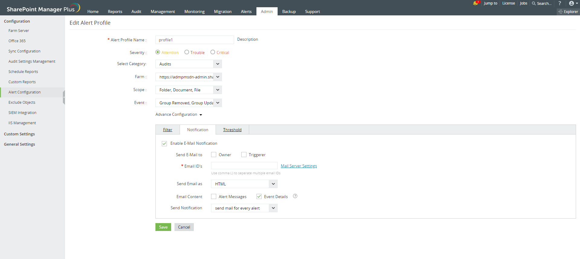 A rendszer rendelkezik a rendszergazdáknak szóló értesítések konfigurálásának lehetőségével. Minden rögzített eseményhez meghatározhatja az üzenet tartalmát. Ennek a szolgáltatásnak köszönhetően az adminisztrátor tájékoztatást kap a környezetben bekövetkező kritikus változásokról.