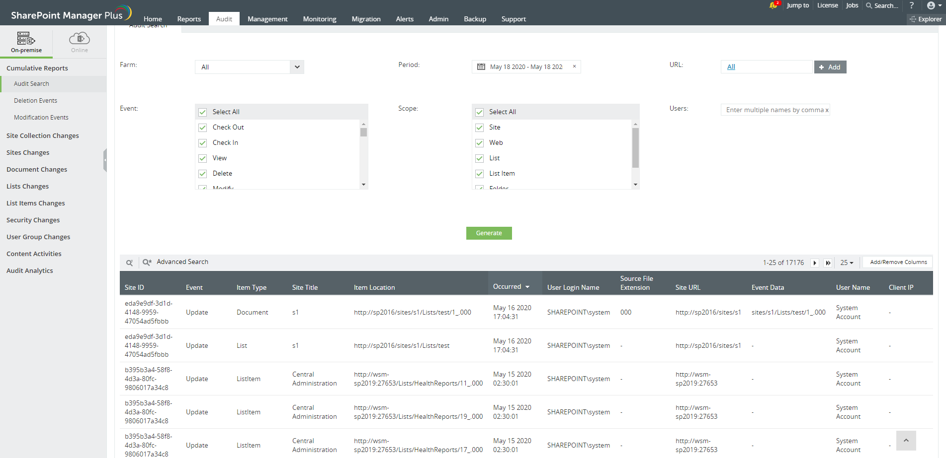 A SharePoint naplózási funkció lehetővé teszi az online és helyszíni erőforrások megtekintését. A rendszer hozzáférést biztosít a környezetben bevezetett archív változások átfogó adataihoz. A létrehozott keresési eredmény elküldhető a kiválasztott formátumú fájlba, például: CSV, PDF, XLS, HTML formátumba.