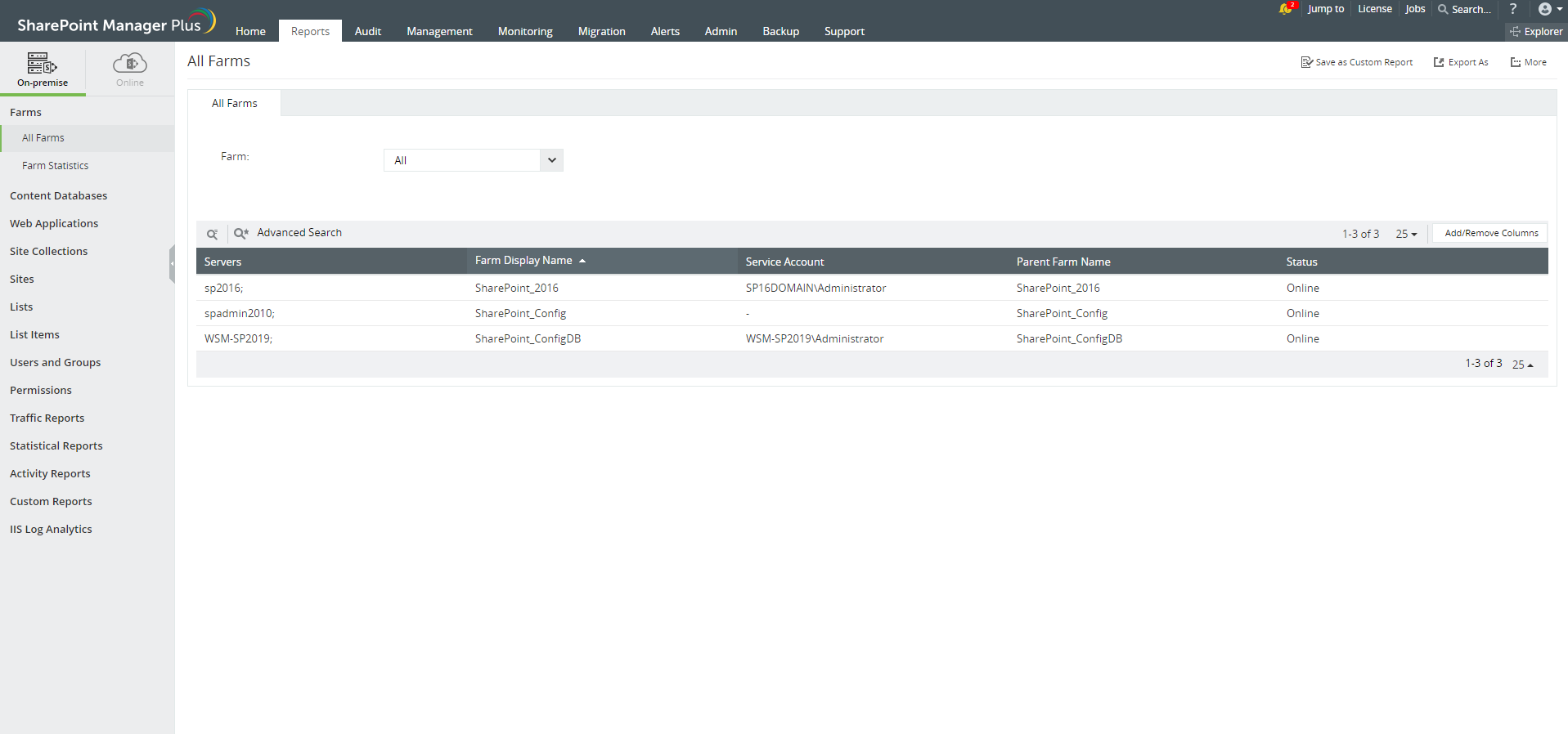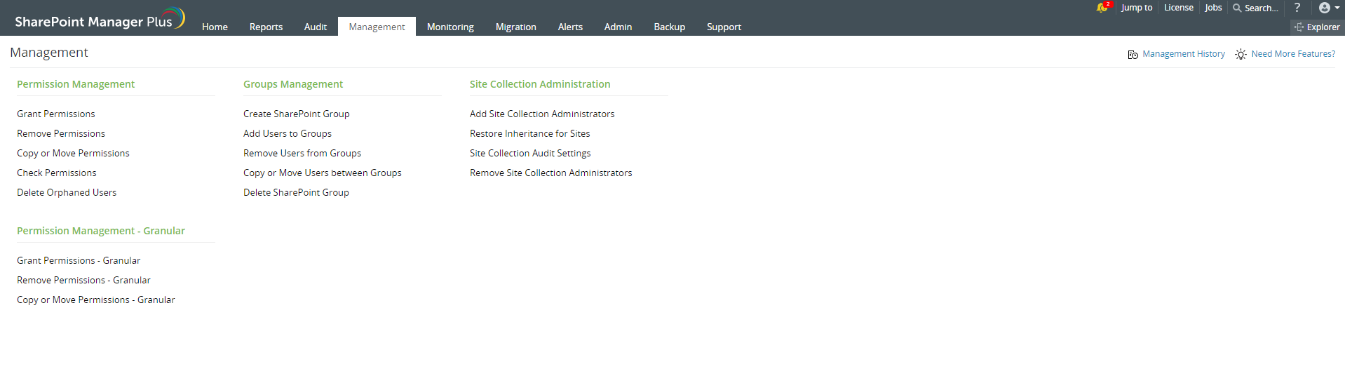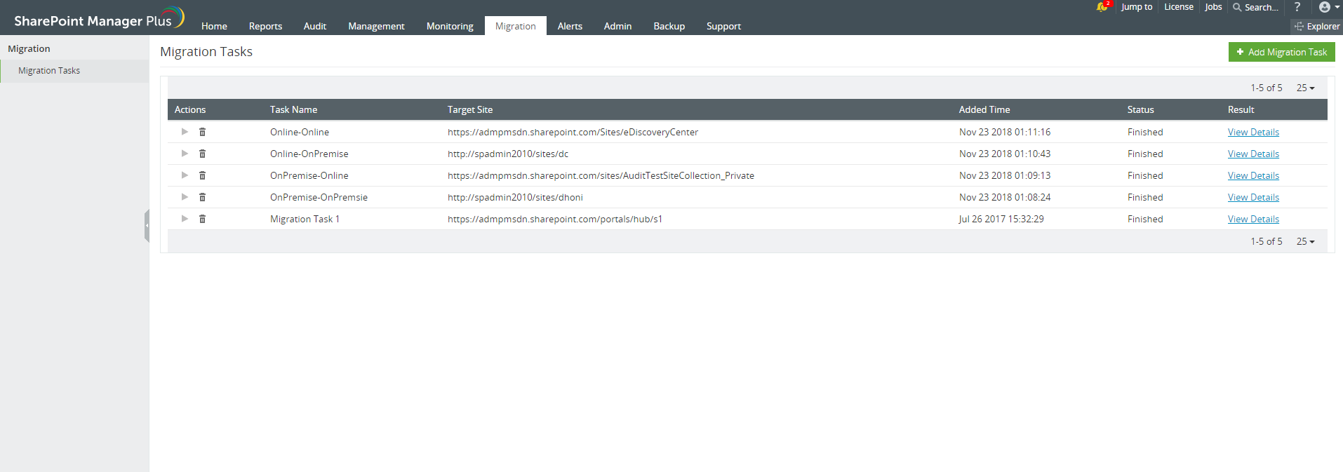 A SharePoint Manager Plus lehetővé teszi, hogy egyszerűen migráljon on-prem-ről az online térre és fordítva, valamint a helyszíniről a helyszíni vagy online verzióra az online térre. Ez lehetővé teszi, hogy könnyedén hozzáférjen adataihoz, és könnyedén mentse vagy hozzon létre belőlük biztonsági mentést. A rendszer lehetővé teszi egyes elemek, például felhasználók, csoportok és minden egyedi engedély átadását is. Lehetővé teszi az áttérés munkaidőn kívüli megkezdését is, ezzel kiküszöbölve a felhasználók leállási idejét.
