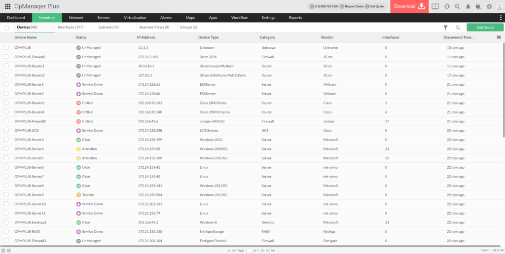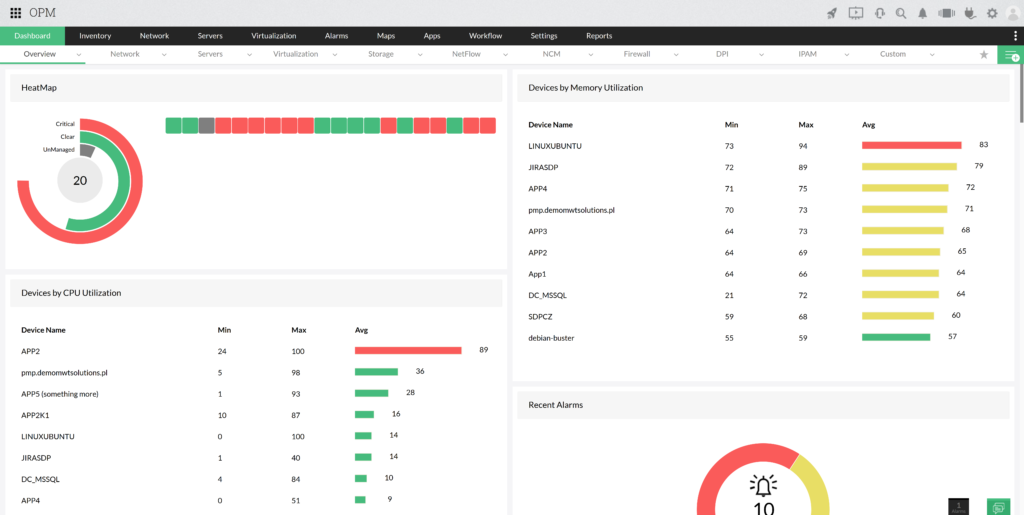 Az OpManager Plus lehetővé teszi az összes hálózati eszköz megfigyelését, a Windowstól kezdve a switchekig. Egy grafikus interfész szintjéről lehetővé teszi a teljes informatikai környezet megtekintését, valamint a legfontosabb paramétereinek ellenőrzését.