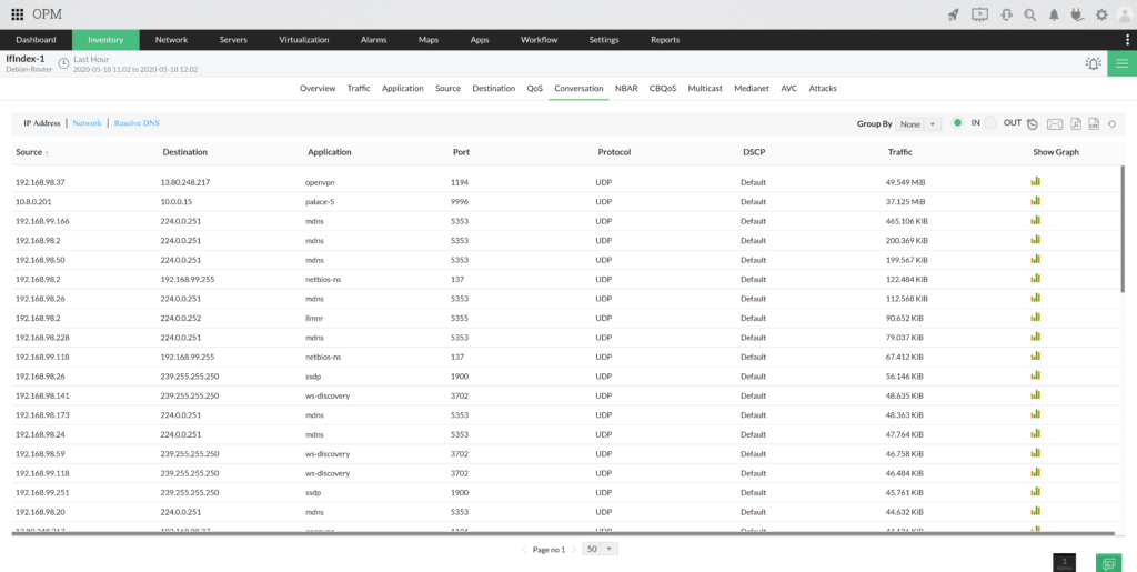 Az OpManager Plus a Flow technológiát használja a hálózat minden forgalmának megtekintésére. A rendszer ezeket az adatokat meghatározott ideig tárolja, és lehetővé teszi a hálózat használatának előrejelzését. Ezen felül ellenőrizhetjük, hogy mely alkalmazások telítik leggyakrabban a sávszélességet.