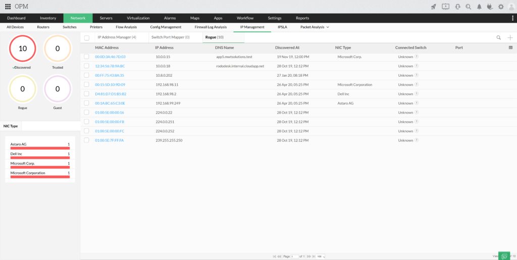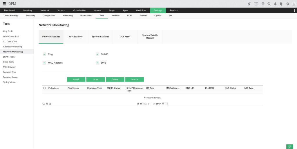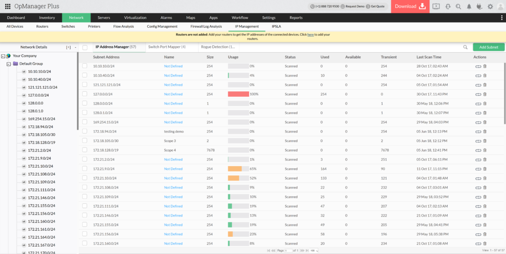 A rendszernek van egy beépített modulja, amely alhálózatokat vizsgál, így megtekintheti a jelenleg használt IP-címzés előnézetét, beleértve az összes szabad és használt IP-címet. Az OpManager Plus DHCP szervereket is használhat erre a feladatra, így még pontosabb képet ad a teljes hálózatról.