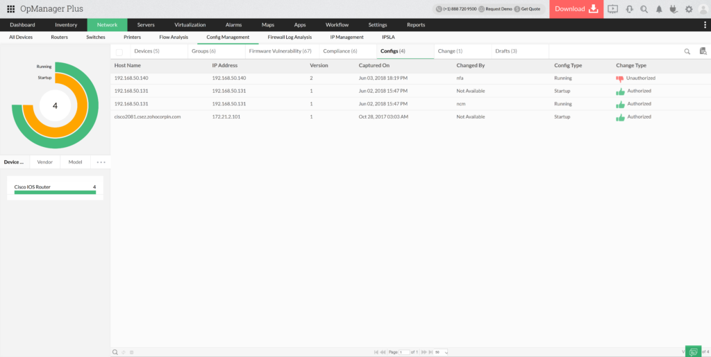 Az OpManager Plus beépített moduljával biztonsági másolatot készíthet a hálózati eszközök konfigurációjáról. A rendszer az aktuális konfigurációt adatbázisban tárolja, és ellenőrizheti a jóváhagyott konfiguráció megfelelőségét, összevetve az eszközön jelenleg működtetettel.