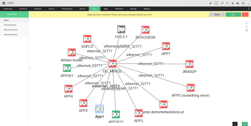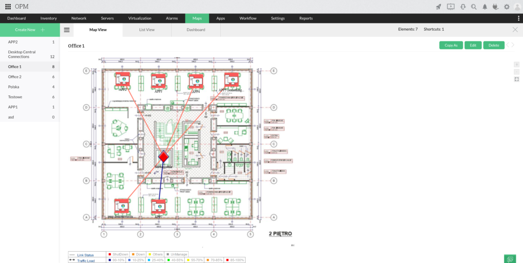 Az OpManager Plus rendelkezik egy modullal, amely felelős a környezetünk megjelenítéséért azáltal, hogy térképet készít az eszközeinkről. A rendszer lehetővé teszi a megfelelő eszközök közötti kapcsolatok megjelölését, valamint azok elérhetőségének és a hálózati interfész statisztikáinak bemutatását. Az üzleti térképek segítenek a környezet felülvizsgálatában a hiba felderítése érdekében.