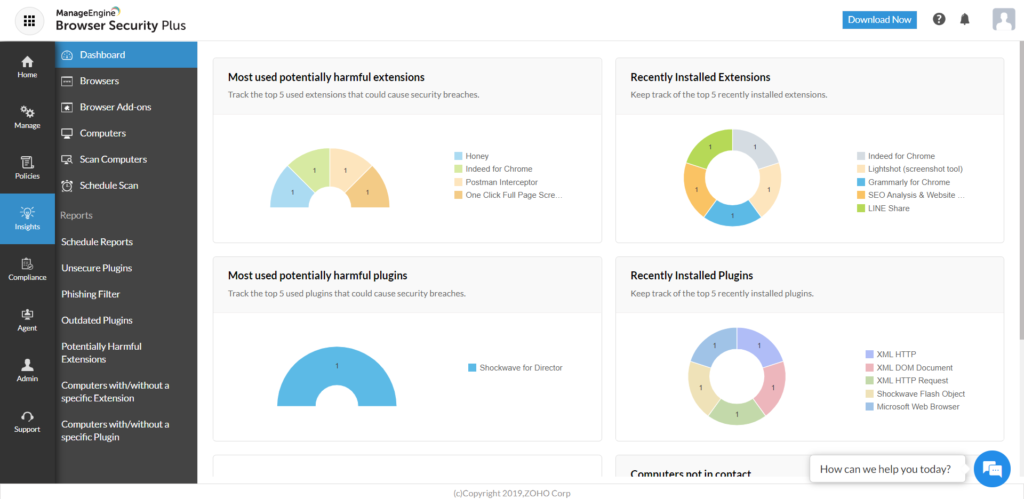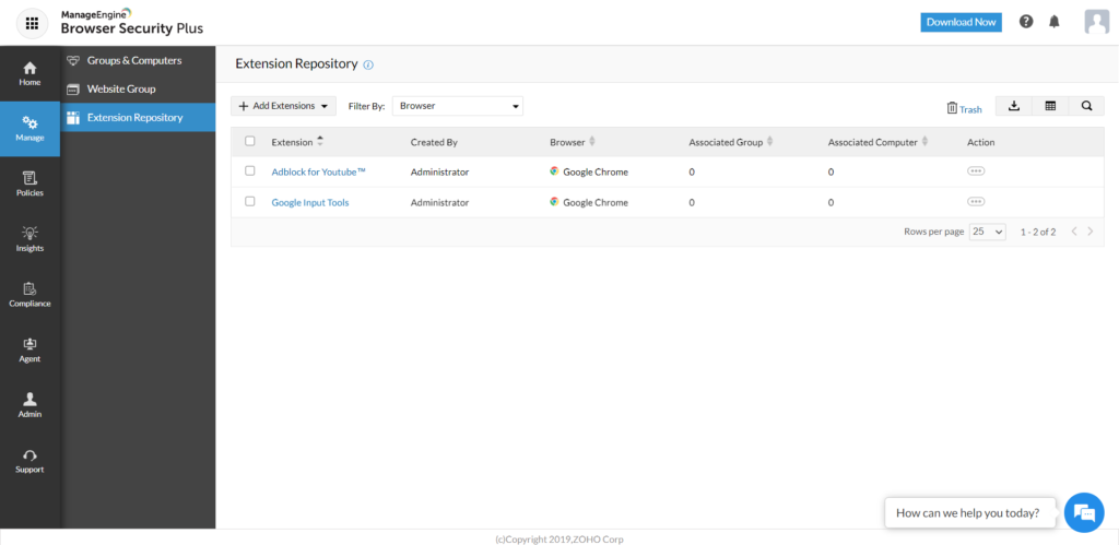 Browser Security Plus felajánlja a szervezetében használt böngésző-kiegészítők tárházának létrehozását. Hozzáférést kapunk a Google Chrome, a Mozilla Firefox és az Edge által ismert összes kiterjesztéshez, amelyeket aztán kiválasztott eszközökre vagy teljes eszközcsoportokra telepíthetünk. Intuitív módon ellenőrizhetjük az adott kiterjesztést használó eszközök és a hozzárendelt csoportok számát is.