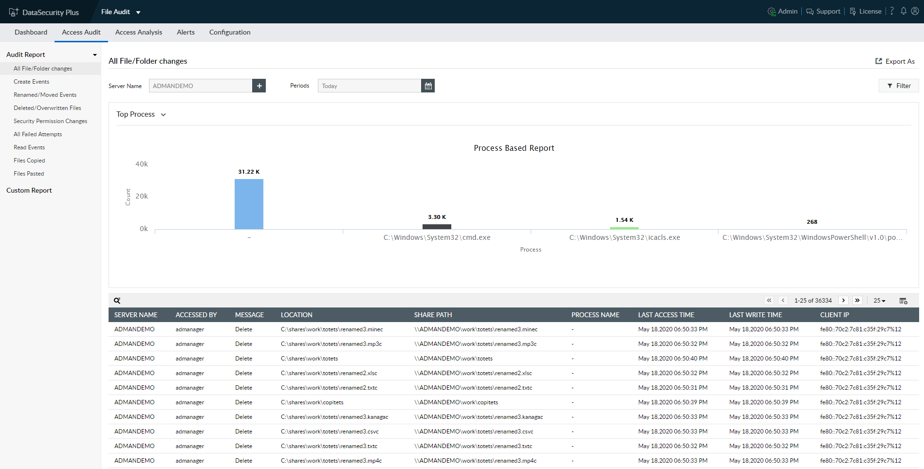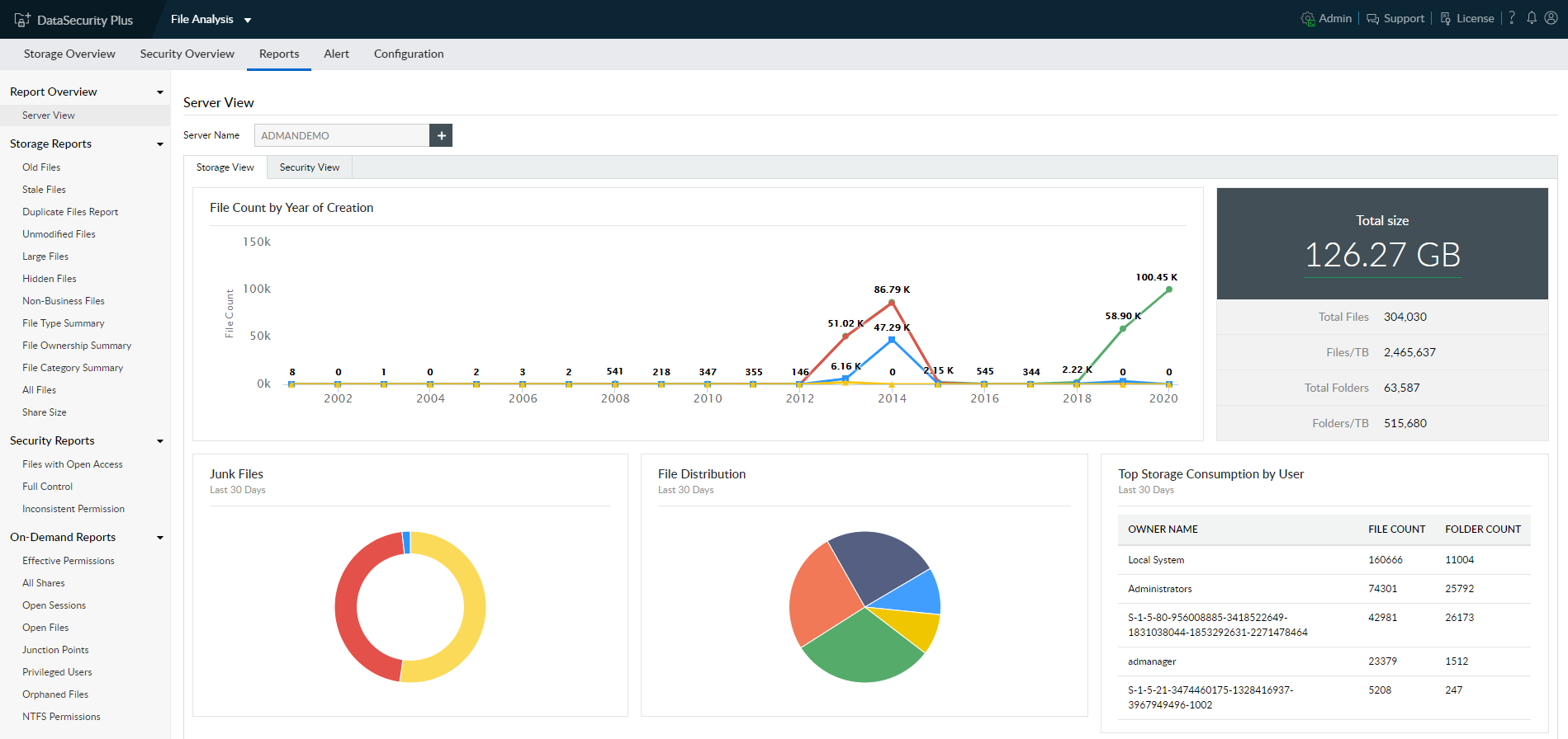 A hálózati megosztások biztonságossá tétele a DataSecurity Plus fő funkciója. A rendszer képes grafikus formában nyomon követni és bemutatni az archív adatokat, például a fájlokhoz való hozzáférést és az azokban végrehajtott műveleteket. A DataSecurity Plus használatával a lemezeken helyileg történt eseményeket is ellenőrizni tudjuk. Érdemes megjegyezni, hogy a megoldás lehetővé teszi a fájl helytörténetének ellenőrzését is.
