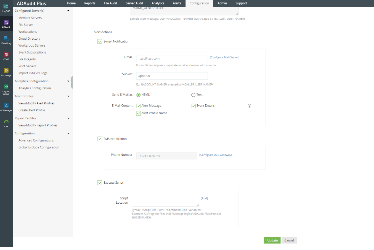 A Log360 rendelkezik a rendszergazdáknak szóló értesítések konfigurálásának lehetőségével. Minden, a rendszer által rögzített eseményhez meghatározhatja az adminisztrátor által kapott üzenet tartalmát. Nagyszámú értesítés esetén a rendszer lehetővé teszi olyan időintervallum létrehozását, amely alatt csak egy üzenet/értesítés küldhető el.