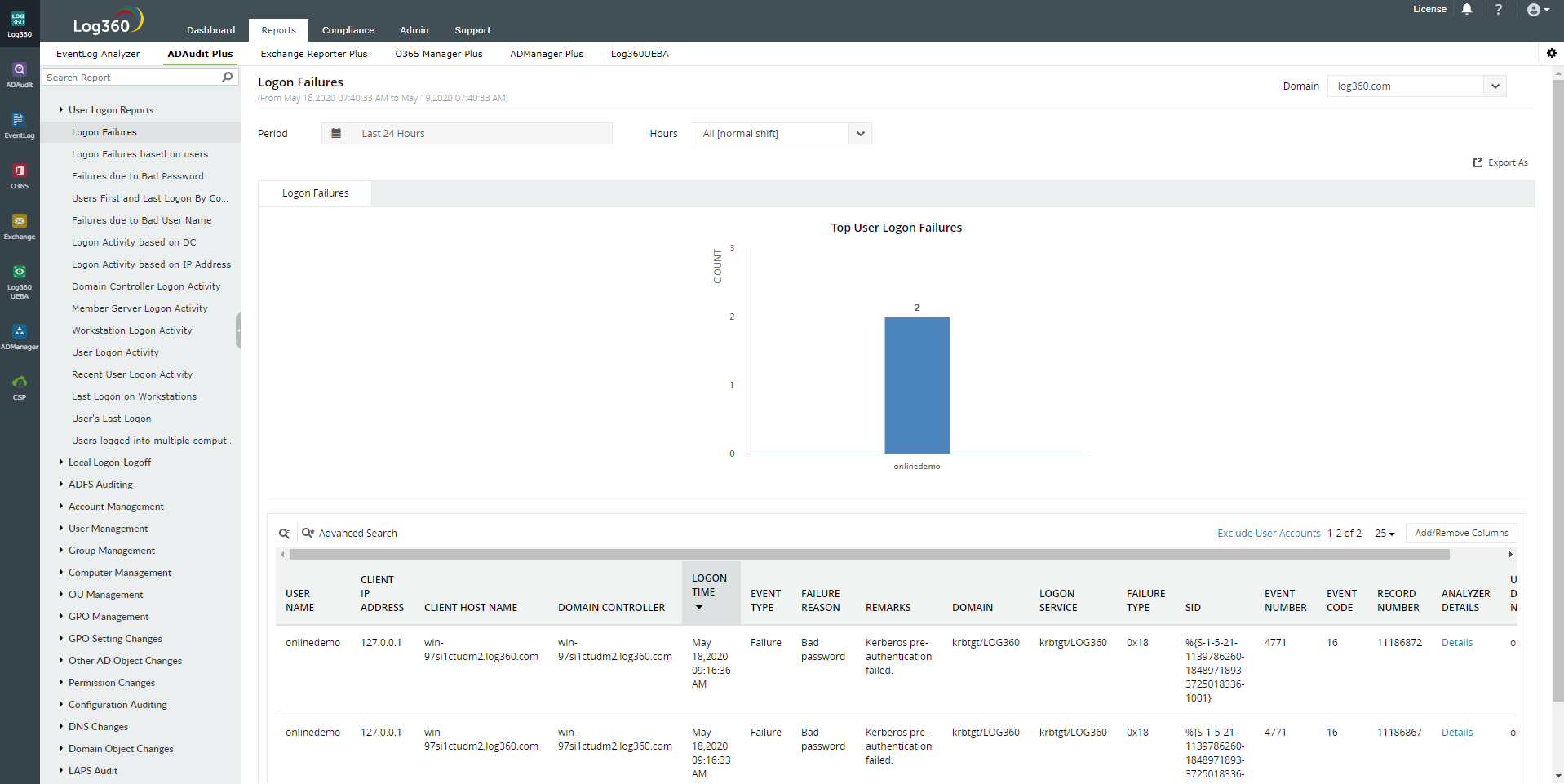A Log360 egy átfogó SIEM megoldás, amely lehetővé teszi az események/naplók elemzését a teljes környezetből.
