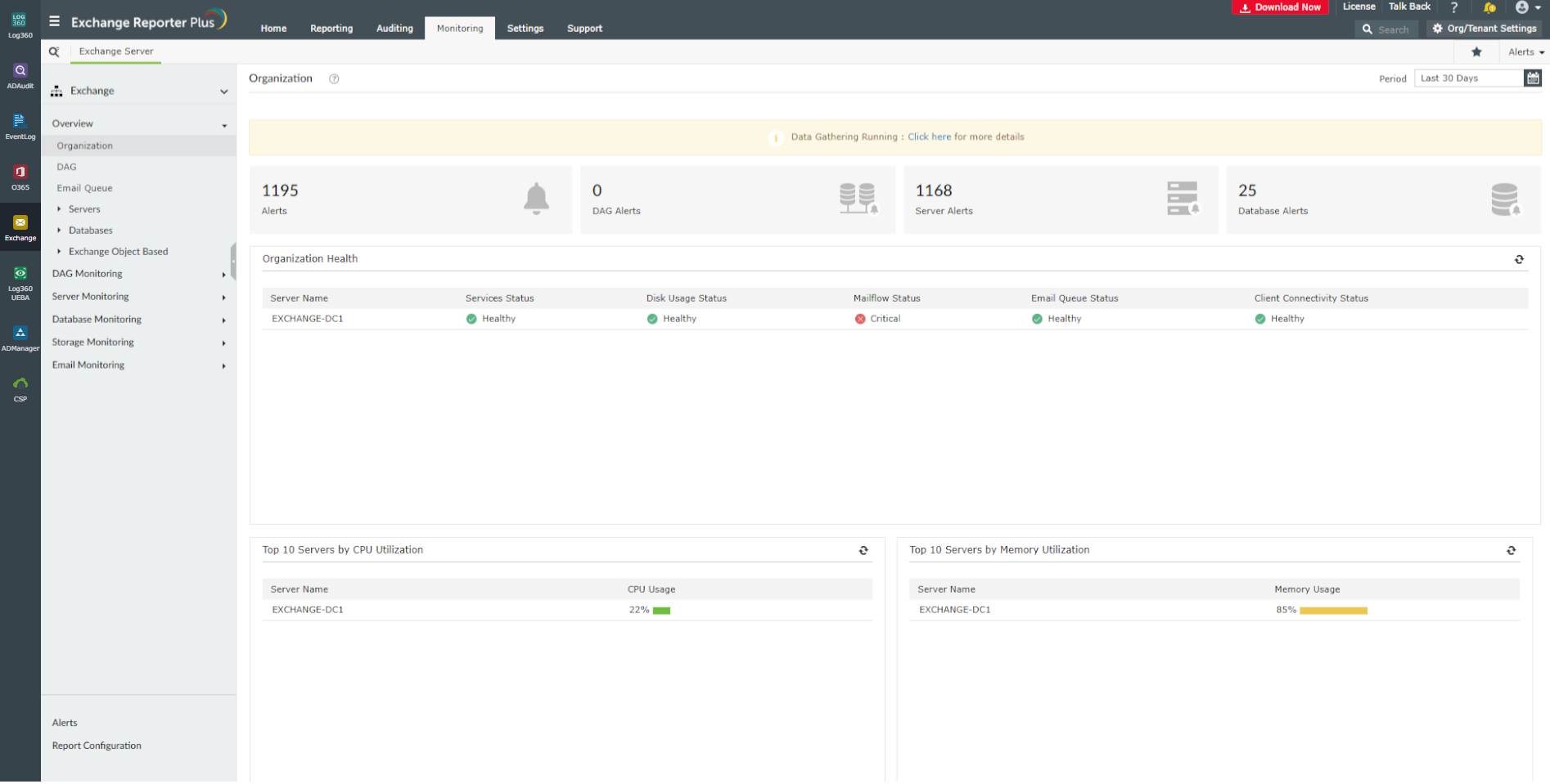 A rendszer képes grafikusan bemutatni az Exchange környezet aktivitását és figyelemmel kísérni annak állapotát. Az irányítópulton láthatók azok a felhasználói postafiókok is, amelyek a legtöbb helyet foglalják el, valamint a maradék helyet a szerveren.