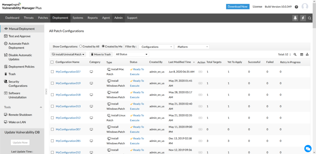 A Deployment modul lehetővé teszi a kiválasztott javítások tesztelését, majd telepítését az egyes alkalmazásokhoz.