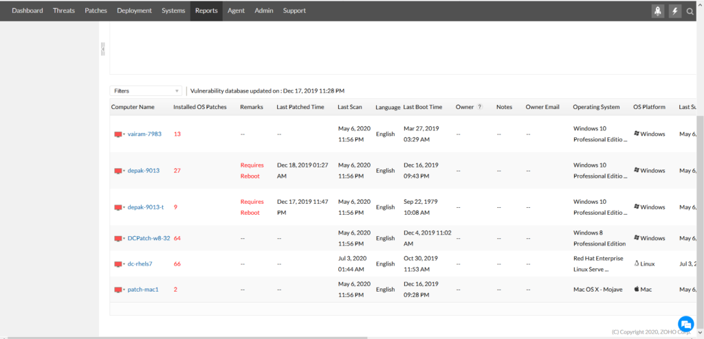 Jelentés a munkaállomások, az újraindítást igénylő rendszerek, a biztonsági kritériumok teljesítésének általános állapotával kapcsolatos adatokról vagy az eltávolított biztonsági javításokról. Az alkalmazás lehetővé teszi mind előre definiált, mind a felhasználó egyedi szükségleteihez lekérdezések útján létrehozott, mind ütemezett jelentések használatát – ciklikusan elküldve a megadott e-mail címekre.
