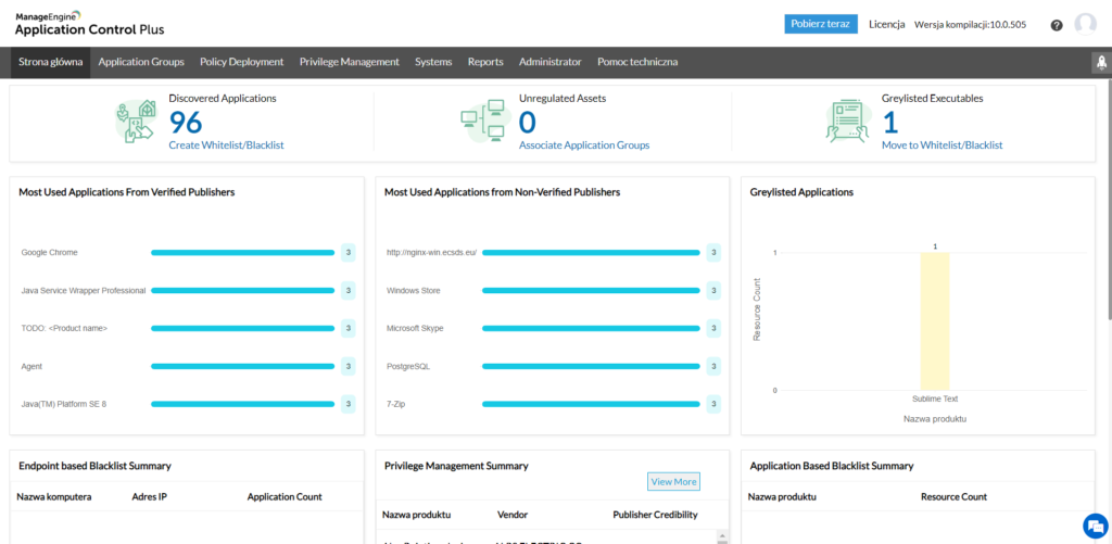 A rendszert az összes alapvető funkció egyszerű használatának szem előtt tartásával tervezték. Bejelentkezés után a kezdőlap minden szükséges információt tartalmaz az adminisztrátor számára, aki hozzáfér az adatokhoz. Ennek a konfigurációnak köszönhetően a szürke lista esetében nemcsak az észlelt alkalmazások aktuális állapotát, hanem az elmúlt mintegy tucatnyi nap trendjét is ellenőrizni lehet.